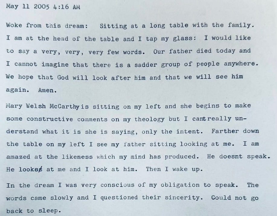 “Farther down the table on my left I see my father sitting looking at me. I am amazed at the likeness which my mind has produced. He doesn’t speak. He looks at me and I look at him. Then I wake up.”