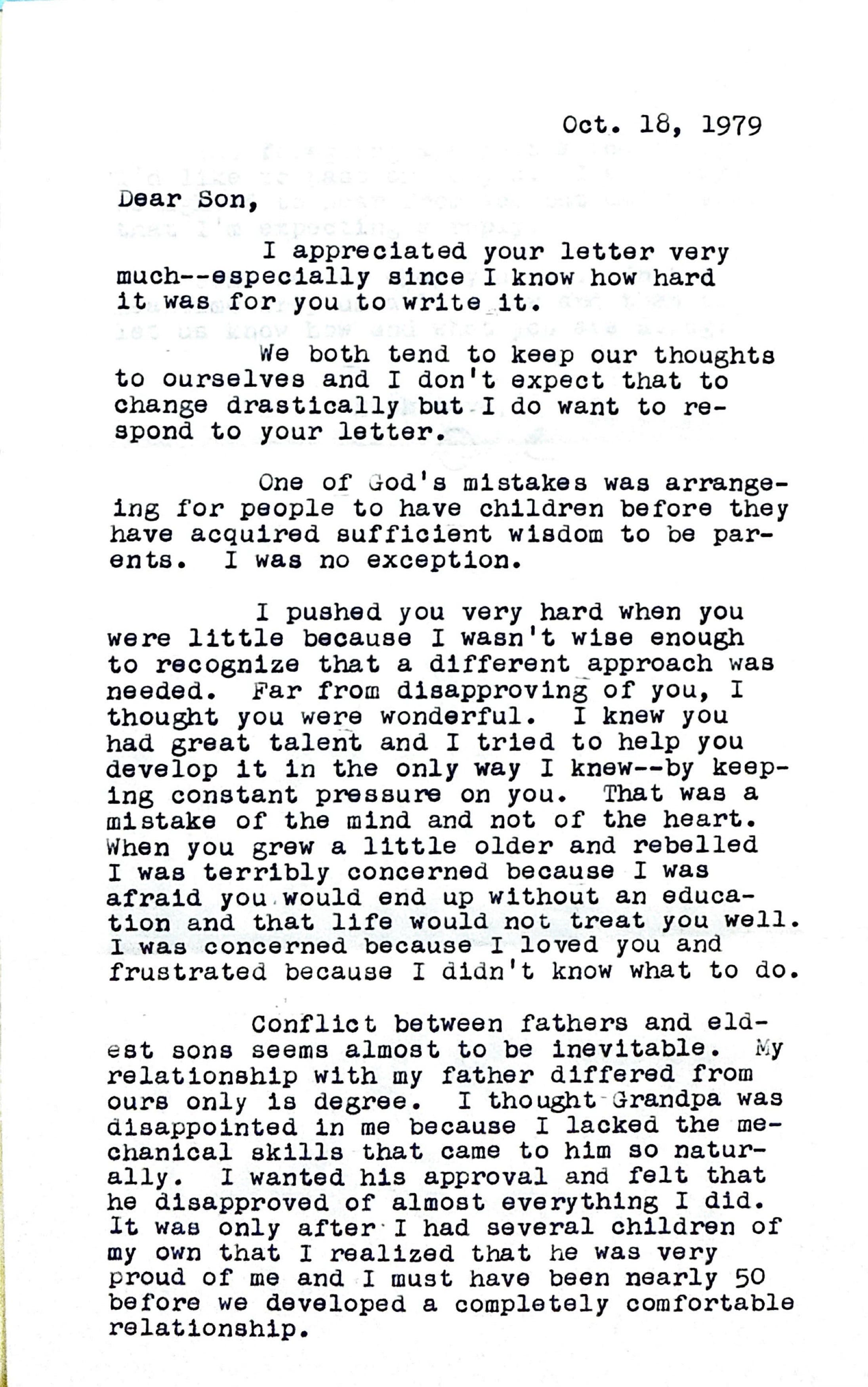 In October of 1979, Charles Joseph McCarthy wrote the following to his son, forty-six years old at the time: