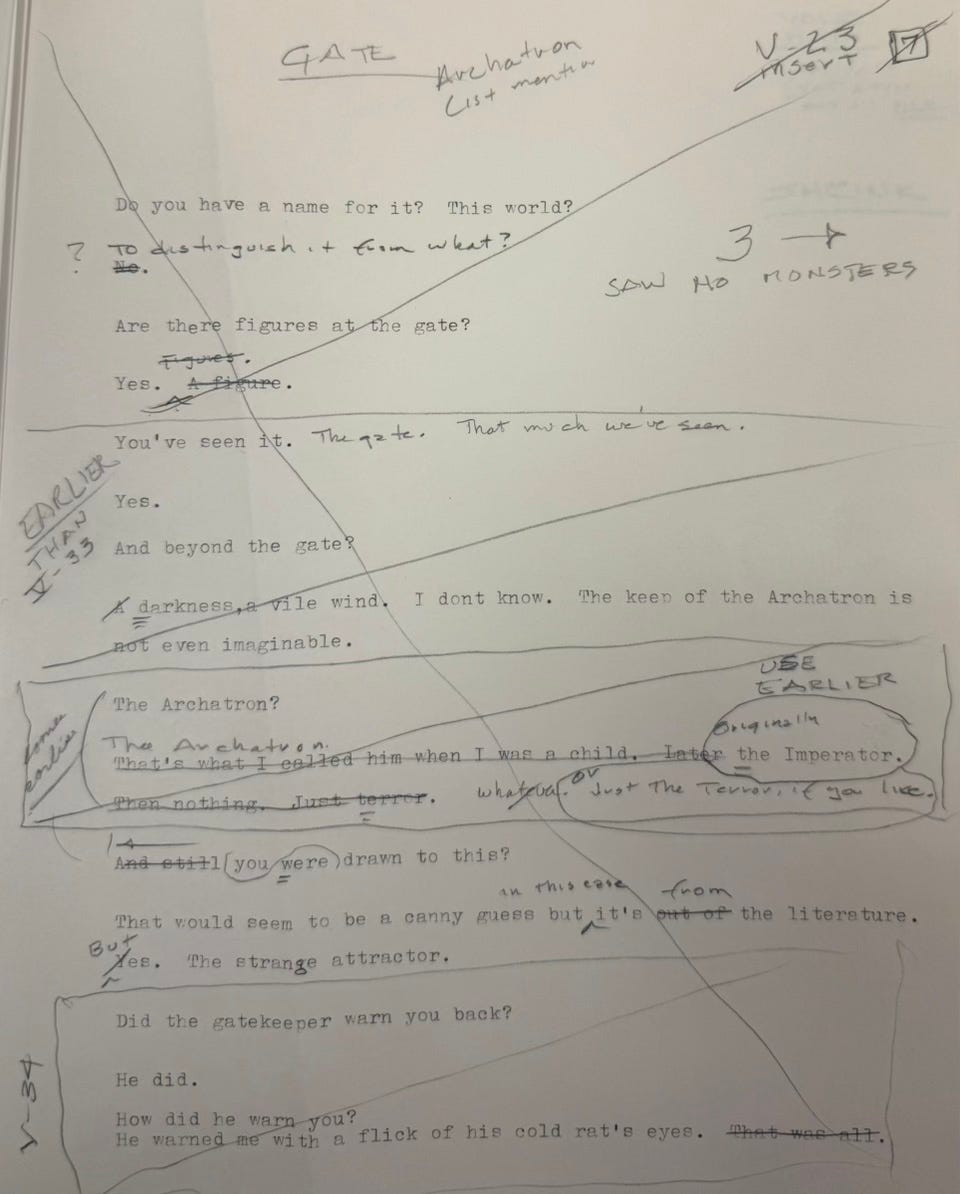 McCarthy decided to cut “Darkness, a vile wind. The keep of the Archatron is not even imaginable” from the finished novel. He also cut “The Archatron. That’s what I called him when I was a child. Later, The Imperator. Then nothing. Just terror.”